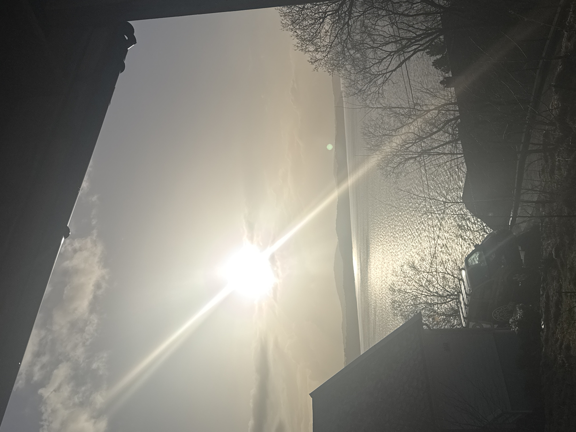 view toward the sea from an elevated perspective, possibly a window or opening. The sun is prominently positioned in the sky, creating bright glare and obscuring details. The sun appears to be over water or reflecting light off water. The scene includes trees and a building rooftop visible on the right side of the frame, which obscures the view. The perspective gives a sense that the picture was taken from indoors, or a structure looking out towards a body of water and sky. Given the location of Bergen, Norway, the body of water is most likely a fjord. The building is dark from the perspective, making it difficult to extract details. The image is rotated from its original horizontal orientation, requiring the viewer to mentally rotate it for a correct perspective.