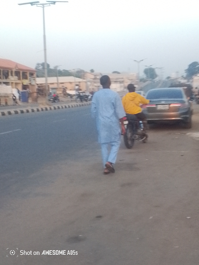 A street scene captures a man in a light blue robe and brown sandals walking along the shoulder of a road