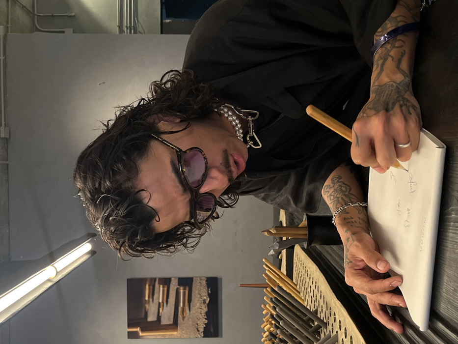 A man with dark, curly hair, a mustache, and tortoiseshell-patterned glasses with purple-tinted lenses is depicted in an indoor setting, likely a creative workshop, retail space, or studio in Mexico City, Mexico. He wears a black shirt, a black overshirt, and a double-strand pearl necklace secured with gold-colored carabiner clasps. Tattoos are visible on both forearms and hands, and he wears a silver braided bracelet and a dark blue bangle on his left wrist, and a plain silver ring on his left ring finger. The man is actively writing on a white notepad with a light-colored wooden pencil, leaning forward with a focused expression and slightly open mouth. In the foreground and mid-ground, a dark ridged table holds a black cylindrical holder with pencils and a larger, brass-colored display rack containing numerous conical and cylindrical writing instruments. On the grey wall behind him, a framed artwork displays several gold-colored bullet-shaped objects arranged on a textured, concrete-like surface. Overhead, a long fluorescent light fixture is visible on the grey ceiling, which also shows exposed conduit piping.