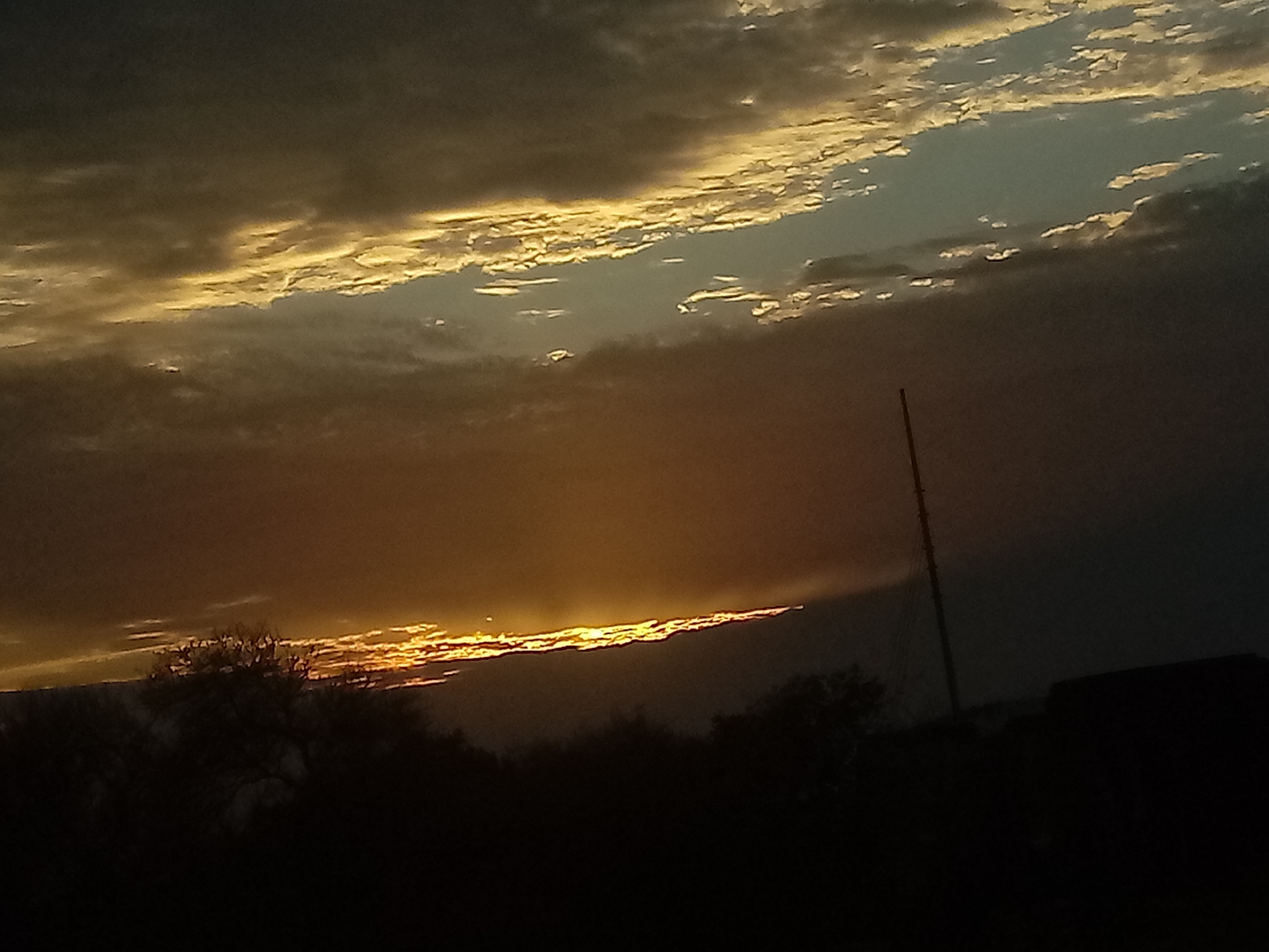 sunset in Juan Griego, Venezuela. The sky is filled with clouds, some illuminated by the setting sun, creating an orange and yellow glow. In the foreground, the silhouettes of trees and possibly a building are visible. A tall, thin pole is also visible against the sky. The overall scene is dark, with only the sunset providing a source of light.