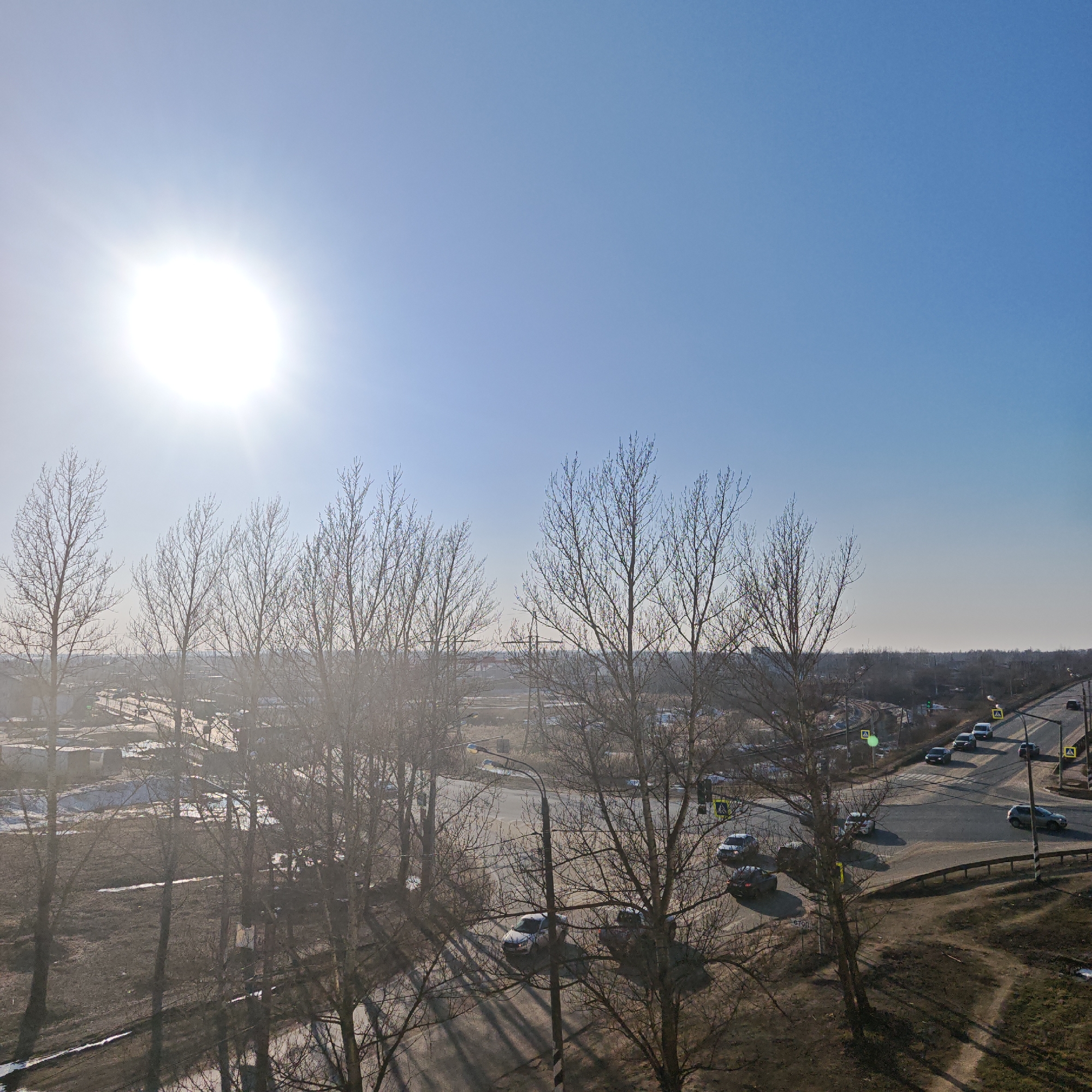 An elevated, high-angle view captures a late autumn or early spring urban intersection under a clear, bright blue sky with a prominent, radiant sun in the upper-left quadrant