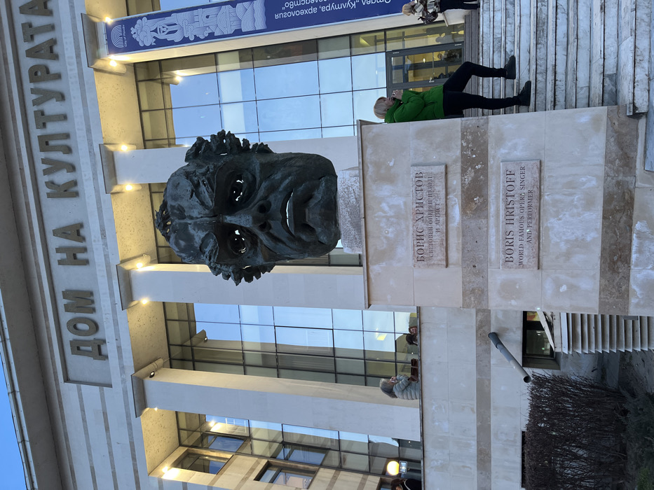 The scene depicts the exterior of the Boris Hristoff House of Culture in Plovdiv, Bulgaria