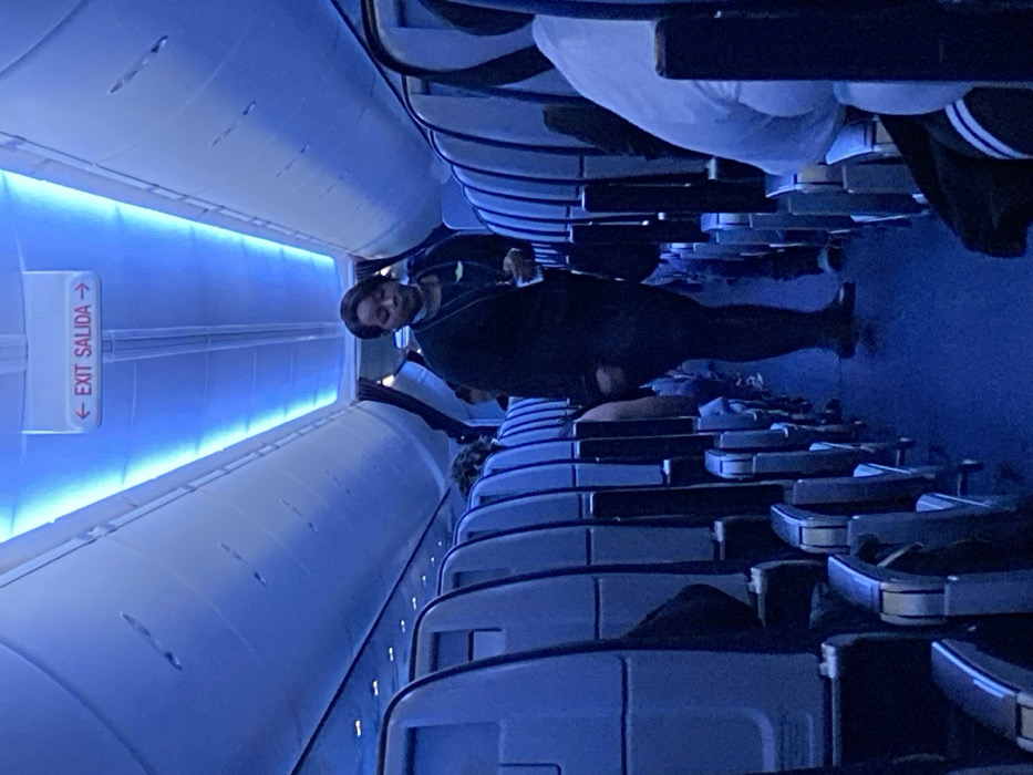 The scene depicts the interior cabin of a commercial aircraft, located at Aeropuerto Internacional Ezeiza, Argentina
