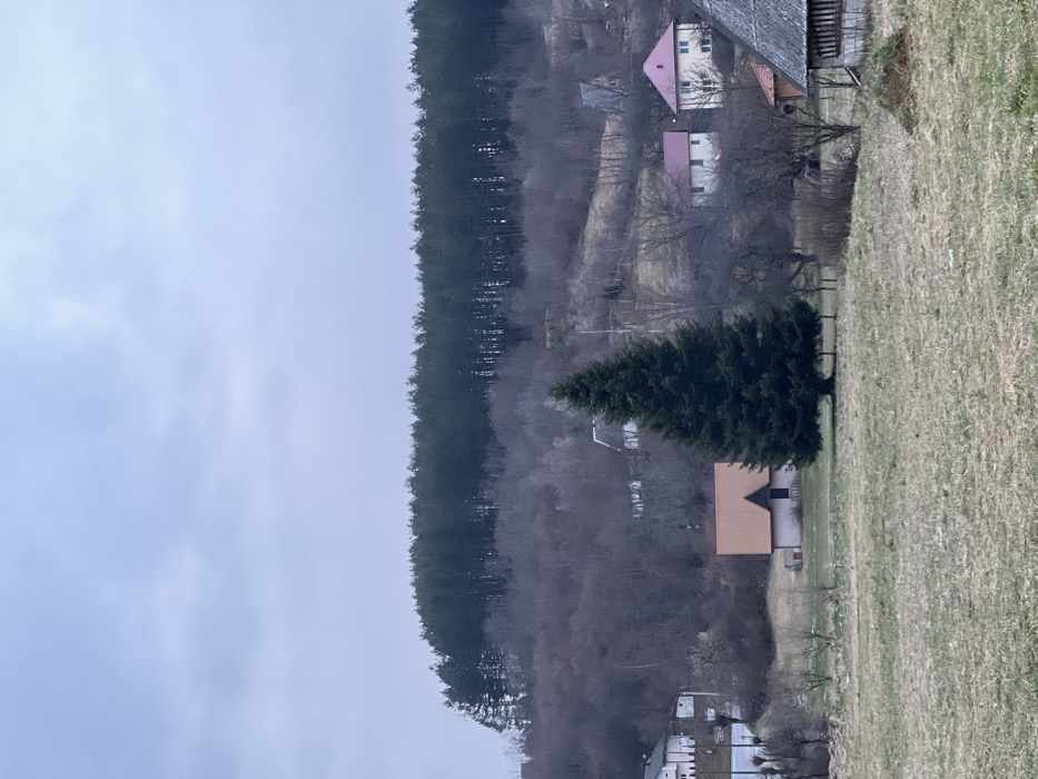 The image depicts a rural landscape in Dulovine, Montenegro, under an overcast sky. The upper third of the frame is dominated by a light grey-blue sky with indistinct cloud cover. A dark green coniferous forest crowns a prominent hill, forming a horizontal line across the middle distance. Below this forest, the hillside slopes downwards, covered predominantly by bare deciduous trees and shrubs, indicating a dormant season. Scattered across the hillside are several residential structures. In the left midground, a multi-story white house with a dark roof is visible. Further right, two houses with light pink gabled roofs and white facades are situated on the slope. Near the far right edge, a single-story structure with a weathered, dark grey roof and visible wooden construction elements stands. A large, dark green conifer tree, likely a fir or spruce, stands centrally in the lower midground, rooted in a grassy field. To its immediate left, a smaller, light-colored house with a distinct orange-brown A-frame roof is present. The foreground consists of a relatively flat, dry grassy field, predominantly light brown with sparse green patches, consistent with late winter or early spring conditions. No individuals or active subjects are present in the scene.
