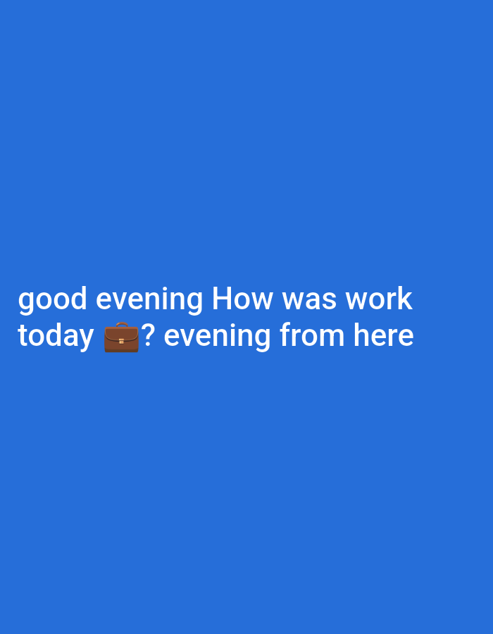 The image displays white sans-serif text centered against a solid, uniform blue background. The text reads: "good evening How was work today 💼? evening from here". A brown briefcase emoji (💼) is positioned between the word "today" and a question mark. The image contains no discernible depiction of people, objects, actions, interactions, or a physical environment, and therefore does not provide visual information regarding a specific location within the city of Nkpor, Nigeria.