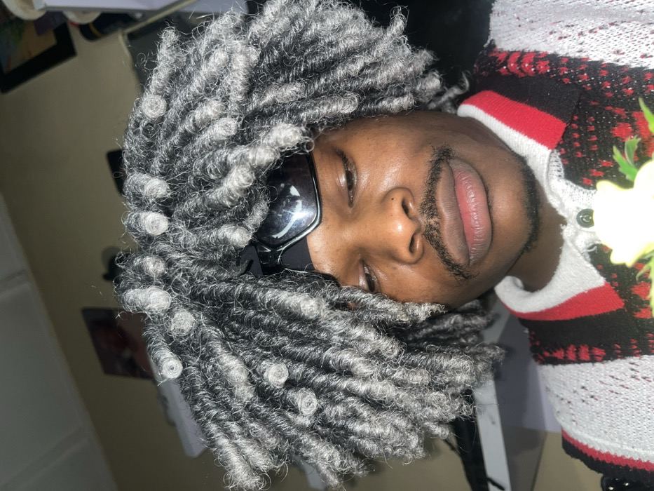 A person with grey dreadlocks and sunglasses is lying down. Their eyes are partially closed. A portion of a red, white, and black patterned sweater is visible, adorned with a small flower. The person has dark skin and a trimmed mustache. The background is blurry, showing a glimpse of a room with a picture frame on the wall. The image is rotated sideways.
