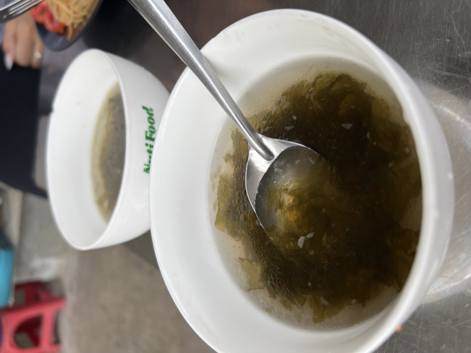 Two white bowls, filled with a watery, dark green liquid, sit side-by-side. A silver spoon rests in the bowl to the right, partially submerged in the liquid. The closer bowl contains what appears to be seaweed. "N.ati Food" is printed in green on the side of the bowl to the left. The backdrop suggests a casual setting, possibly a restaurant or kitchen.