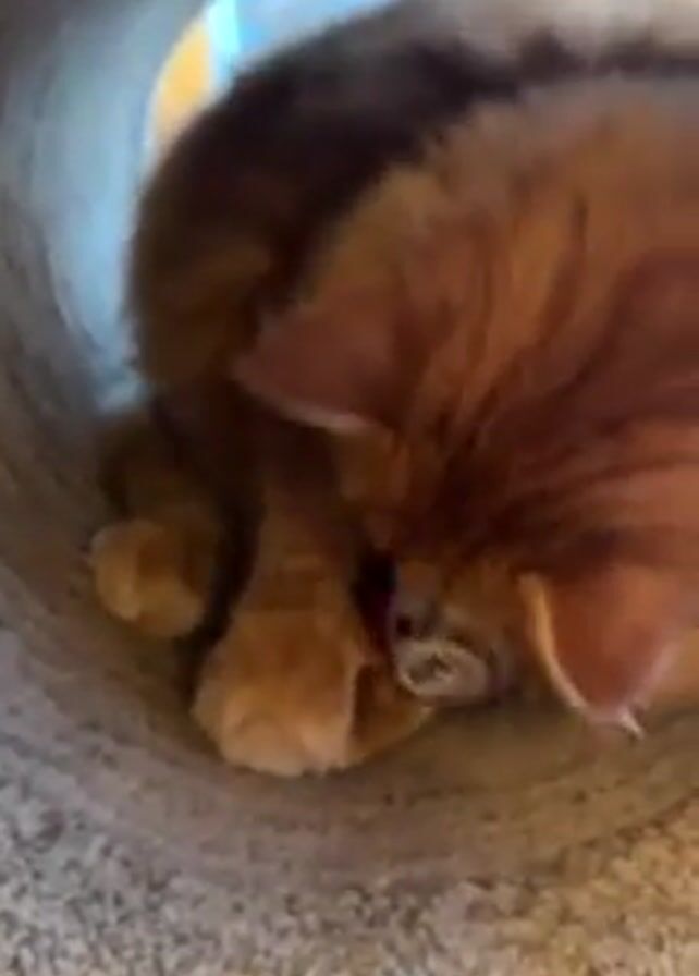 An orange cat is sitting in a carpeted cat tunnel. The cat begins licking its paws. The camera pans up to show the cat's head and then down to the base of the cat tree next to a window.