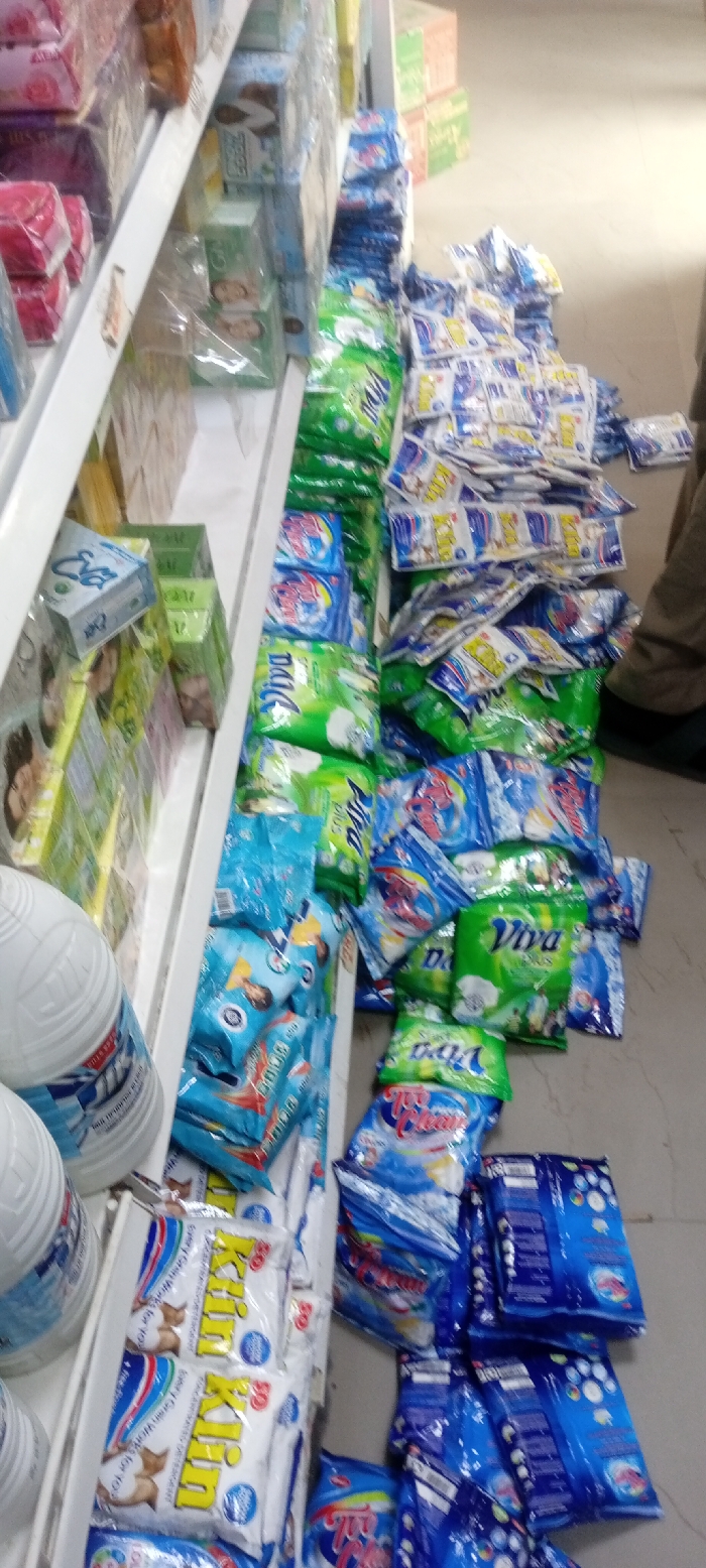 This image depicts an indoor retail environment within the city of Sani Mai Nagge, Nigeria, likely a store aisle