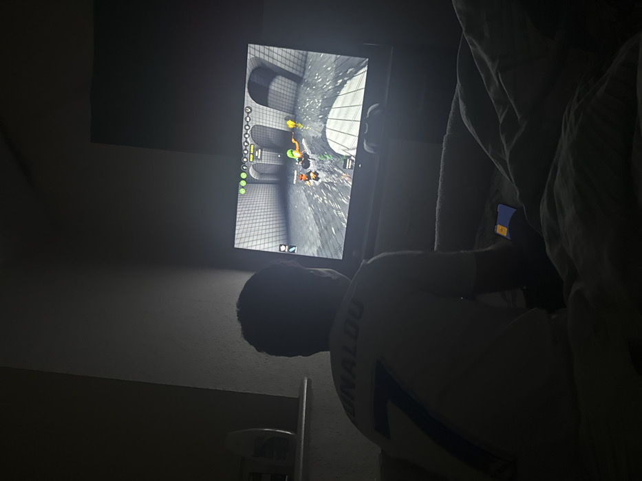 An individual, viewed from behind, is seated in a dimly lit indoor setting, facing a television screen. The subject wears a white short-sleeved shirt with "RONALDO" and the number "7" clearly visible on the back. A smartphone with an illuminated yellow and blue screen rests on a surface to the right of the individual. The television displays a video game set in a 3D environment characterized by grey tiled walls, multiple arched passages, and water effects on the floor. Two distinct game characters, one predominantly orange/brown and another green/yellow, are visible interacting within the virtual water. The game interface includes a "CASH LEVEL" indicator and multiple circular icons at the top of the screen. A dark object, potentially a game controller, is situated on a surface directly beneath the television. The room's background features light-colored walls, with a shelf on the left holding a small, circular, reflective object. The individual is positioned on what appears to be a bed or sofa, partially covered by light-colored bedding. The scene is observed to be taking place in an unspecified indoor location within Welshpool, United Kingdom.