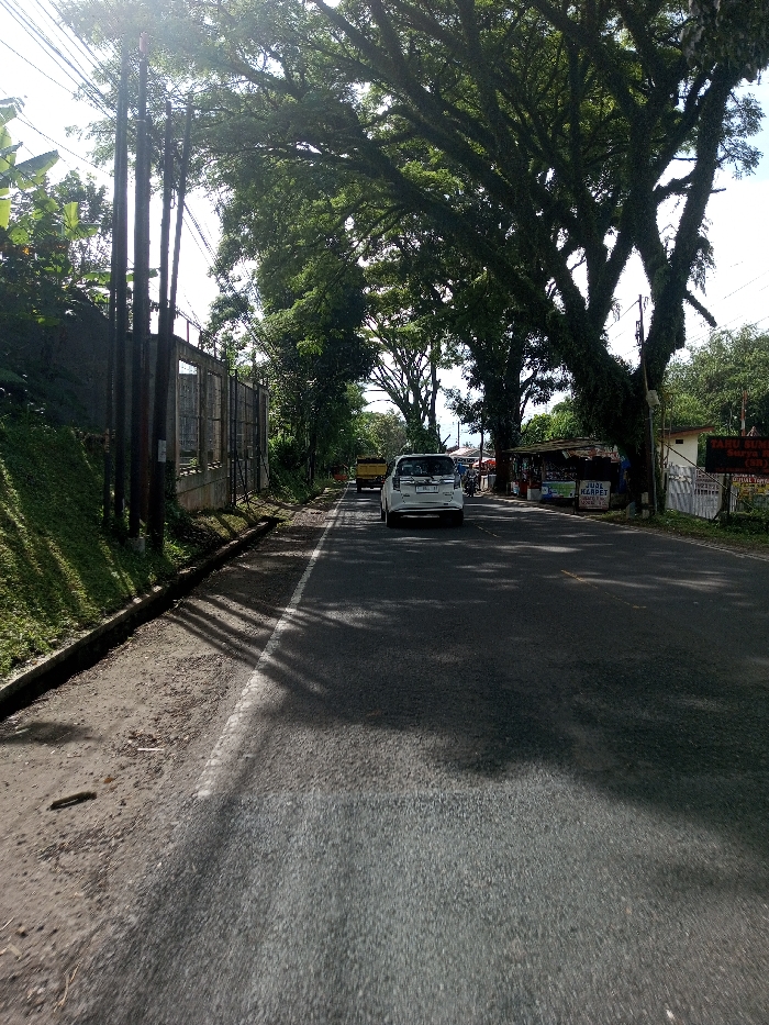 This image depicts a roadside scene in the city of Domphoog_Dungkarchhoeling, Bhutan. The paved asphalt road, featuring a white solid line marking the left shoulder and a broken white center line, extends into the distance, appearing to slightly curve to the right. On the left side of the road, a dirt shoulder borders a grassy embankment. A series of approximately five dark utility poles, supporting multiple overhead wires, are erected along this margin. Behind the poles, a metal fence with a concrete base separates the road from dense green foliage and trees covering a higher ground. On the right side of the road, several large, mature trees with extensive, dark green canopies line the thoroughfare, casting prominent shadows onto the asphalt. These trees exhibit significant growth on their branches, possibly moss or epiphytes. Beneath the trees, several small, open-fronted commercial stalls or kiosks are present. One stall displays a sign with the prominent text "JUAL KARPET". Further down the road, a white building is visible, featuring a dark sign with red lettering that appears to partially read "TAHU SUMBER SURYA MA...". Two vehicles are visible traveling away from the viewer in the right lane. The lead vehicle is a white sport utility vehicle (SUV) or minivan, followed by a yellow truck. No pedestrians or other individuals are discernibly present. The scene is illuminated by bright daylight, indicating clear weather and a lush, verdant environment.