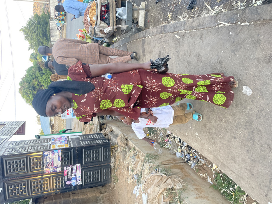 An adult female and a young male child are depicted walking on a concrete sidewalk in what appears to be an urban street scene in Jos, Nigeria, during daylight hours. The female, positioned slightly left of center in the foreground-midground, is of African descent, wearing a black headscarf and a two-piece patterned outfit consisting of a peplum-style top and a long skirt, both featuring brown fabric with lime green circular and starburst motifs. She has a small earring in her visible ear. Tucked into her outfit at her right side is a clear plastic water bottle. Her right hand holds a small black object, possibly a plastic bag. Her gaze is directed downwards and to her right. The child, a young male toddler or preschooler, walks alongside the female, holding her left hand. He is wearing a white t-shirt with red text, light brown pants, and light blue sandals. His right hand holds a clear plastic bottle, and he looks upwards and to his left. To the left of the pathway, a concrete drainage channel is filled with various refuse, including plastic bottles, bags, and general litter. Beyond this channel, an unpaved, dusty area with more debris is visible, leading to a dark, patterned metallic structure (potentially a building facade or kiosk) adorned with multiple colorful posters advertising events, including one for an "ANNUAL YOUTH FESTIVAL." To the right of the main subjects, another concrete pathway or road extends into the background. A wooden market stall or cart is visible on the right, displaying goods such as watermelons and trays of peanuts/groundnuts. More litter is scattered on the ground near the stall. In the mid-background, several other individuals are present. One male in a light brown patterned tunic and trousers walks away from the camera. Another male in a light blue shirt is visible to the far right, appearing to use a mobile phone. A three-wheeled vehicle (auto-rickshaw) is visible further down the road. Buildings and green foliage, along with a distant hilly terrain feature, complete the background. The lighting suggests late afternoon or early evening.