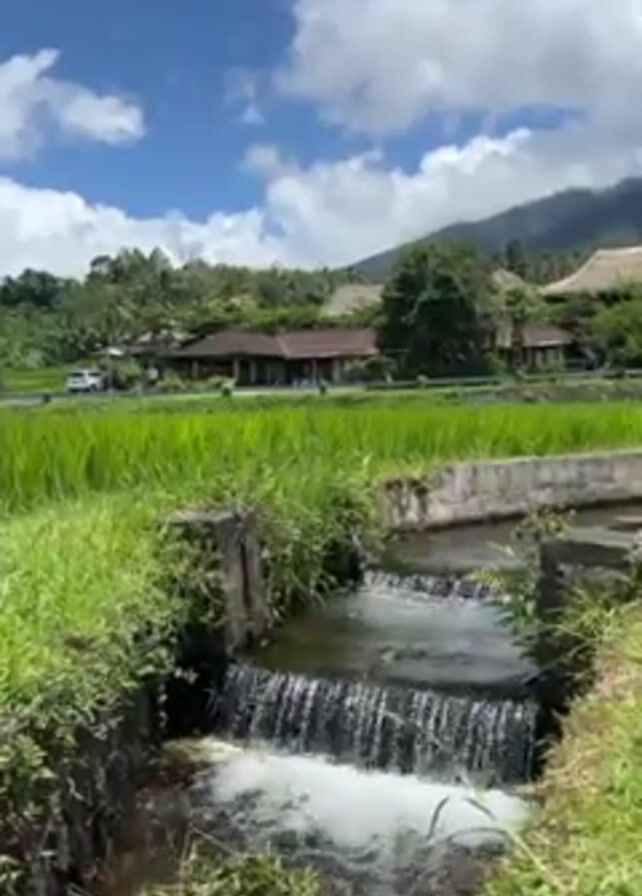 landscape scene featuring a small artificial waterfall in the foreground, with rice paddies and a series of buildings in the background. The waterfall consists of two small drops of water flowing over concrete structures in a narrow channel. The rice paddies are green and lush, occupying the space between the channel and the buildings. The buildings in the background appear to be part of a complex or village, with one building having a distinctive thatched roof. A white vehicle can be seen parked near the buildings. The sky is bright blue with scattered white clouds, and there is a mountain visible in the distance, partially obscured by clouds. The camera is static, capturing the scene in a steady shot.