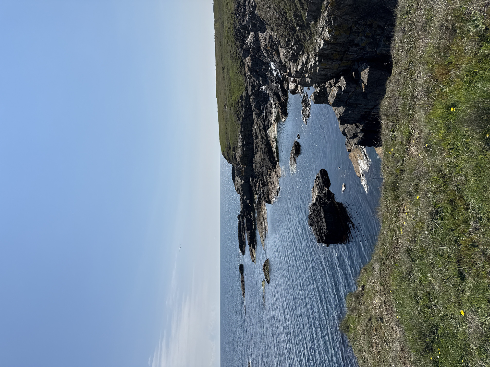 coastline in Ahtopol, Bulgaria. A rocky cliff with grass on top meets the blue sea. The sky is clear with a slight haze on the horizon. There are no people visible. The main subjects are the cliff, the sea, and the sky. The rocks form small inlets along the coast.