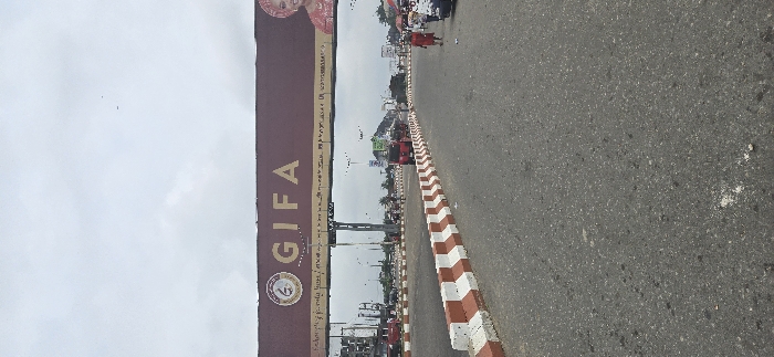 The image displays a daytime view of the Itam Junction in Uyo, Akwa Ibom State, Nigeria, under an overcast sky. A large, maroon-colored overhead banner spans the width of the main road, featuring "GIFA" in gold lettering along with a circular logo on the left and a portrait of a woman on the right. The foreground reveals a gray asphalt road, partially sectioned by a line of alternating red and white painted concrete barriers extending from the lower-left towards the middle-right. Vehicular traffic, including several red tricycles (Keke Napep) and other cars, is present on the road, moving through the junction. Multiple pedestrians are visible, primarily on the right side of the road, with one individual in a red garment walking towards the right foreground. Streetlights and commercial structures are visible beyond the junction.