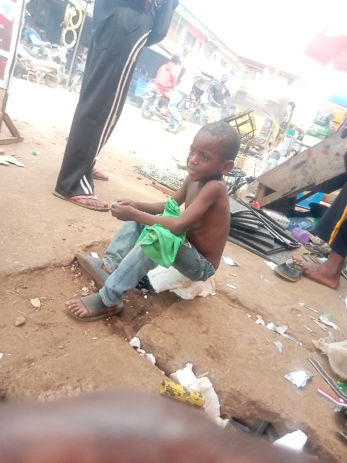 A young, shirtless boy sits on what appears to be trash in an outdoor setting
