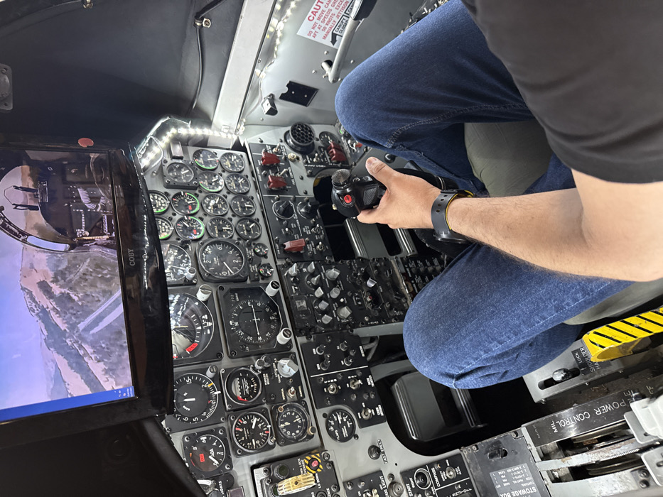 A person sits in a cockpit simulator, gripping a control stick with a red button
