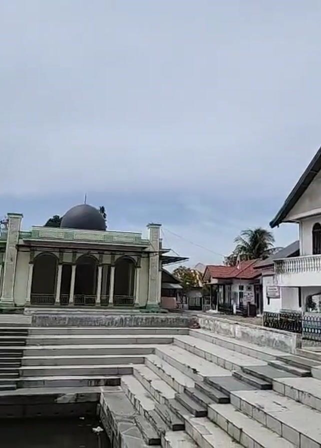 The camera slowly pans leftward across a scene of a partially drained, multi-tiered, rectangular, concrete pool lined with steps. The pool is positioned in front of a small, domed building with pillars and a light-colored facade. Beyond the pool and building are a collection of small, varied residential structures, and a taller communication tower. The sky is overcast and the lighting is muted. The overall scene depicts a blend of architectural styles and a sense of quiet urban landscape.