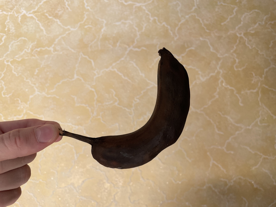 - "A single human hand, observed from the knuckles upwards, holds an overripe, dark brown to black banana by its shriveled stem" by FM-aSc183, licensed under CC BY 4.0