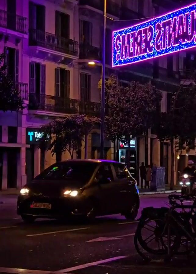 The video depicts a street scene at night. Several vehicles pass by, including cars and a scooter. A person on a bicycle briefly enters the frame. Buildings line the street, and a sign with blue and pink neon lights hangs above the road. Streetlights illuminate the area.