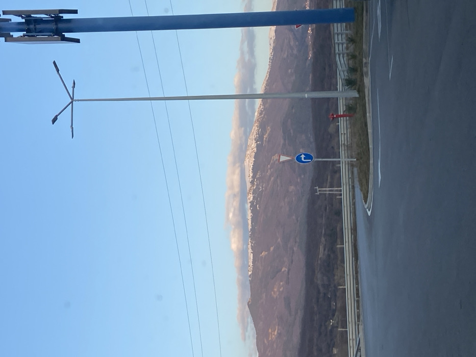 The image depicts an outdoor daytime scene situated in the vicinity of Pernik, Bulgaria, featuring a road junction or exit ramp in the foreground with mountainous terrain in the background. The sky is clear and blue, with a few elongated white clouds positioned above the distant mountain ridge. Multiple circular artifacts, consistent with lens flares or sensor dust, are visible in the upper sky. The background is dominated by a large mountain range. The uppermost sections of the mountains are covered in snow, appearing white, while the lower slopes present a varied topography of darker, possibly forested areas and lighter, reddish-brown patches of sparse vegetation. In the mid-ground, a tall, slender grey street light pole with four outward-extending arms, each fitted with a light fixture, stands vertically slightly right of the image center. To its right, a thick, blue-painted metal mast, appearing to be a telecommunications or cellular tower with attached equipment, is partially visible. Several horizontal black utility wires traverse the upper mid-ground. A metal guardrail runs horizontally, separating the road from the lower terrain. A red fire hydrant is visible on the grassy median strip, situated behind the guardrail and to the right of the grey streetlight pole. Two road signs are present: a triangular white "Give Way" sign with a red border, mounted above a circular blue sign displaying a white arrow indicating a mandatory right turn. The foreground comprises a dark grey asphalt road surface that curves sharply to the right. White painted road markings include a solid line defining the edge of the paved surface and a white arrow on the pavement indicating a right turn. A raised, grass-covered median strip separates sections of the road at the curve. No individuals, vehicles, or animals are present in the scene.