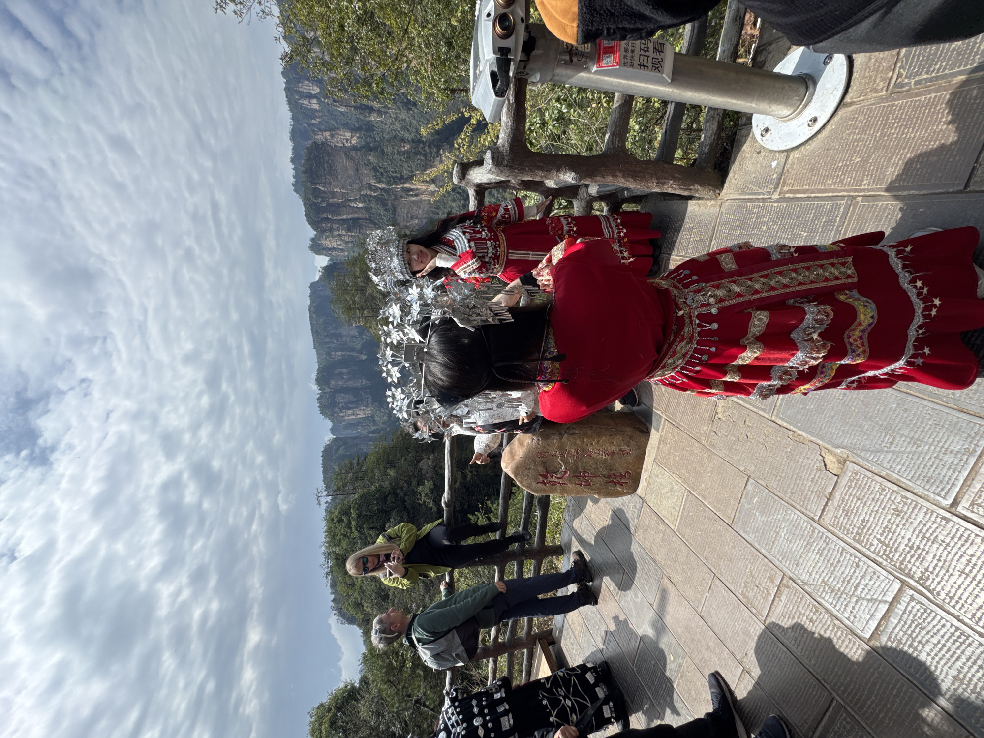 An elevated outdoor viewing platform, likely in the Wulingyuan Scenic Area near what is referred to as Luoguta, China, is depicted under a partly cloudy sky. In the background, numerous towering, heavily forested sandstone pillars characteristic of the region rise from a valley. On the wooden-railed platform, eight individuals are visible. In the foreground, a person with their back to the camera, dressed in an ornate red traditional garment with silver and gold embroidery and a silver headpiece, is holding a smartphone, seemingly photographing another person. This second individual, also female and wearing a similar traditional red dress and elaborate silver headpiece, stands in the mid-ground, posing with one hand to her face and smiling towards the person taking her picture. To the left, a blonde-haired woman in a bright green jacket and sunglasses is perched on the wooden railing, holding a smartphone and appearing to capture media. Beside her, a man with grey hair and a backpack leans against the railing, observing the scene. A reddish-brown stone tablet with carved red Chinese characters stands centrally on the platform. To the right, a silver, pole-mounted binoculars viewer is present, with another partially visible person next to it. The platform surface is composed of textured rectangular paving stones.