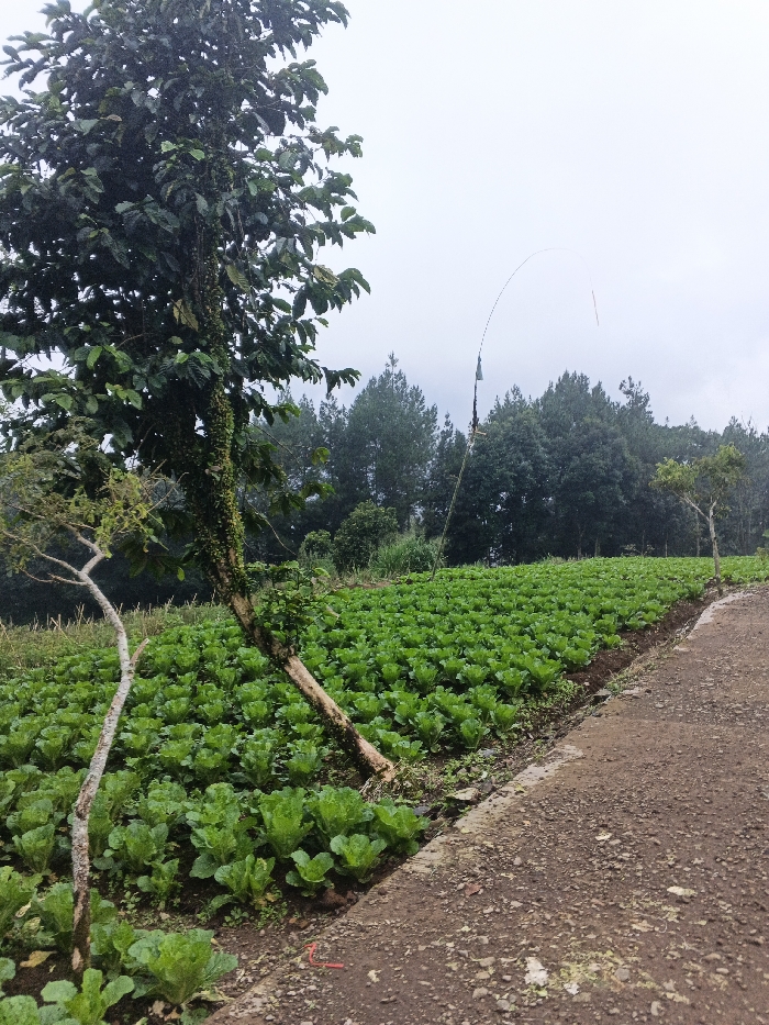 A landscape shows rows of green leafy crops, likely cabbages, filling a field. A thick tree covered with vines stands on the left. In the background are tall, dark green pine trees under a gray sky. A dirt and stone path runs along the side of the cultivated field. A thin, curved pole stands above the field with a small orange flag hanging from it.