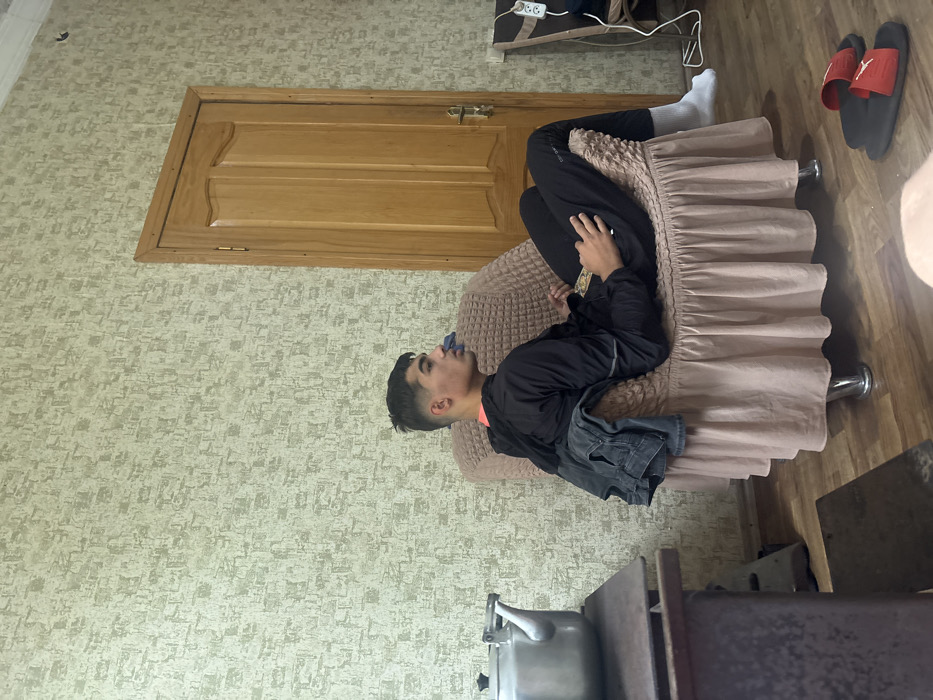 The scene depicts an interior room in Bulishi, Georgia. A young male, with short dark hair, is seated in a light pink or beige armchair, upholstered with a ruffled skirt-like cover, facing towards the left side of the frame. He wears a black long-sleeved athletic top, black athletic pants, and white socks. A pair of dark denim jeans is draped over the back of the armchair. His hands rest in his lap or on his thighs. To the left, a dull metallic kettle with a black handle and knob is positioned on a dark, square, stove-like metal object or table. Behind the armchair, a light brown wooden door with two vertical panels and a dark handle is set into a matching wooden door frame. The walls are covered in light green/beige wallpaper with a textured, abstract pattern. On the light-colored laminate or wood floor, near the bottom right, a pair of black slides with red straps and a white Jumpman logo are visible. In the background on the far right, a white power strip with multiple outlets and an attached cable rests on a brown, woven furniture piece.