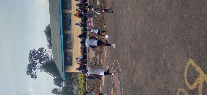 People stand on an asphalt court in front of a building. The building has a metal roof and multiple windows. A tree is visible to the left of the building. There are other people seated further back. The asphalt has a painted circle with colors inside. A yellow arrow is painted on the surface.