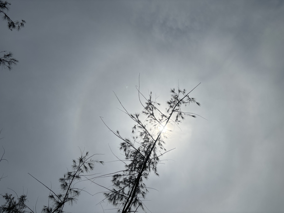 Silhouetted branches reach towards a bright, hazy sun in a cloudy sky. The branches are sparse, with thin needles, suggesting a pine-like tree. A faint halo effect surrounds the sun, possibly caused by ice crystals in the atmosphere. The sky is overcast with subtle variations in gray tones. The overall composition emphasizes the contrast between the dark foliage and the diffused sunlight.
