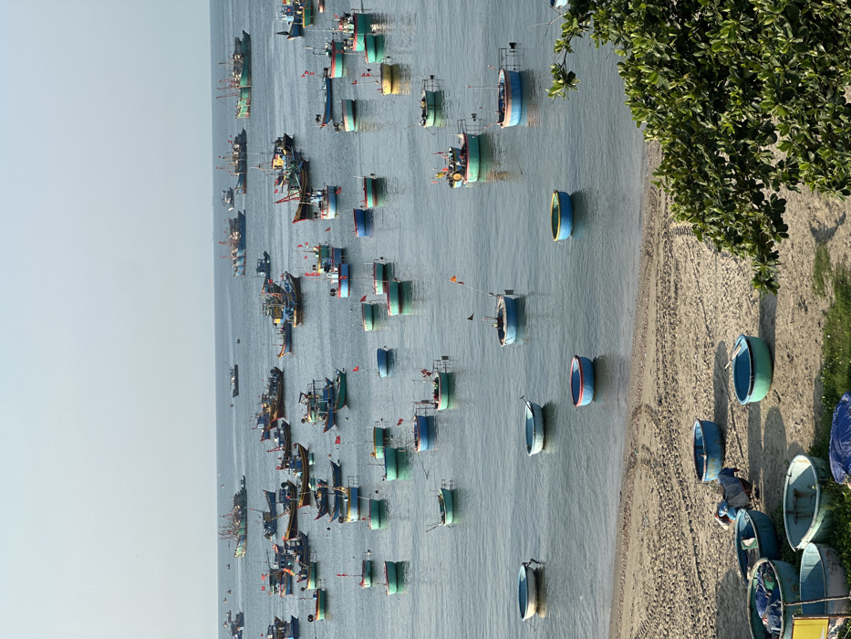 beach with many boats. The boats closer to the shore are round and blue. Further out in the water are larger fishing boats. A sandy beach is on the right side of the image with green foliage. The sky is gray.