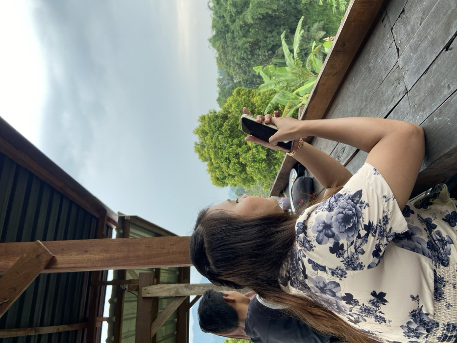 The image depicts an outdoor or semi-outdoor viewing area in Tamiajeng, Indonesia, characterized by a rustic wooden structure. The foreground features a dark-stained wooden plank surface, likely a table or bar, where a woman is positioned. She is seen from the right side, with long, dark brown hair, wearing a light-colored short-sleeved blouse with a blue and grey floral pattern. Her left wrist displays a gold-colored bracelet. She holds a silver-colored smartphone vertically with both hands, her thumbs positioned to interact with the screen. Her forearms rest on the wooden surface. Behind the primary subject, to the left, a person with short dark hair, wearing a dark shirt, is partially visible, seated with their back mostly towards the camera. Further back, a third person is partially obscured, identifiable by what appears to be a light-colored head covering. On the wooden surface near the main woman's left arm, a black object resembling a small bag or case and a white object (possibly a dish or container) are present. The background reveals a lush, verdant landscape dominated by various green trees and tropical foliage, including large-leafed plants resembling banana trees. Distant hills or mountains are visible under an overcast or cloudy sky. Wooden structural beams and a corrugated metal roof are visible in the upper frame, indicating an open-air or sheltered viewing platform.