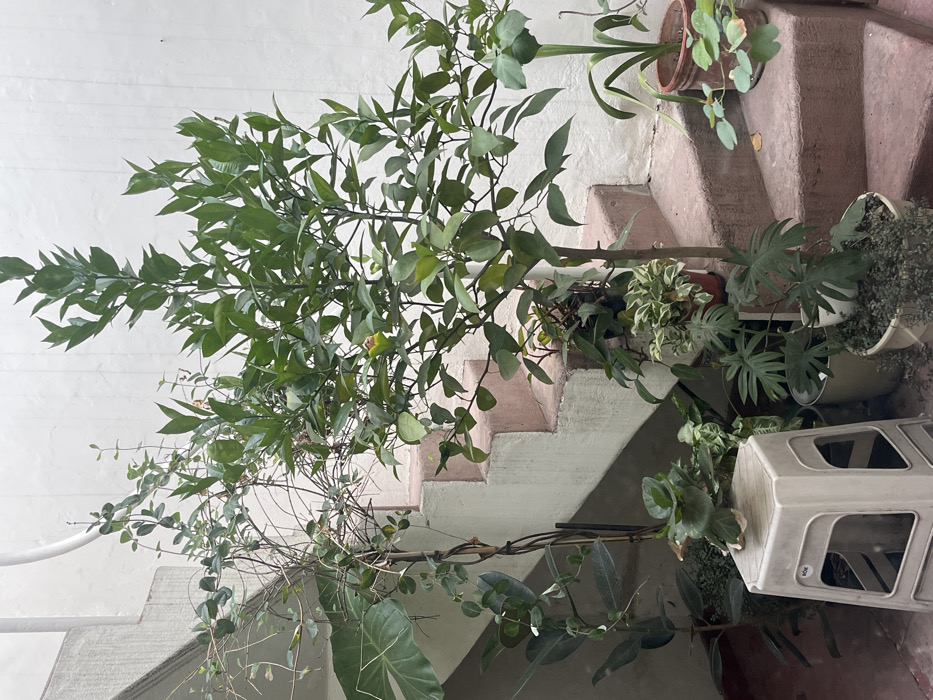 A verdant plant with lush, green leaves dominates the scene. It cascades around and along a set of stone stairs adorned with potted plants. The stairs are a soft, muted color. The plants consist of various sizes and species. A plastic crate stands on the ground at the bottom of the stairs. The overall composition gives a sense of enclosed outdoor space.