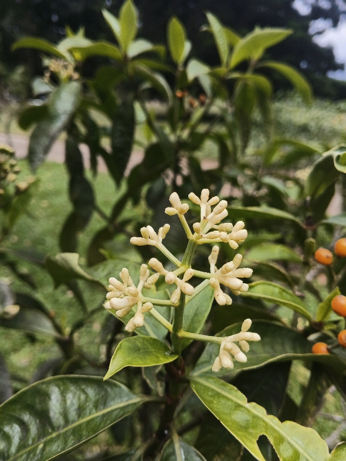 A close-up photograph depicts a plant branch in Masaiti, Zambia, in sharp focus against a blurred background. The primary subject is a cluster of numerous light yellow-cream, club-shaped flower buds, arranged on a green stem. Several dark green, glossy, ovate leaves are visible, some exhibiting minor damage such as a small hole on the lower right leaf. In the out-of-focus background, clusters of small, spherical, orange fruits are discernible on another part of the plant or an adjacent shrub. The very blurred background consists of green foliage and a lighter green area, possibly grass or a dirt path. No people or animals are present.