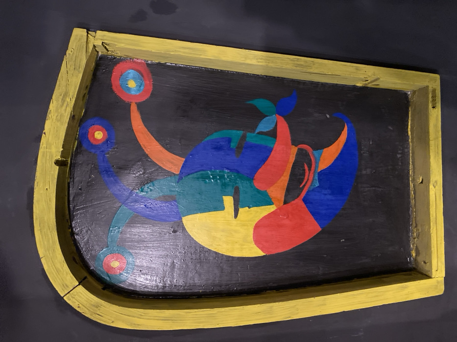 The image displays a vertically oriented, framed artwork depicting an abstract, multi-colored jester-like or stylized moon face. The artwork is contained within a bright yellow, arched wooden frame, exhibiting visible wear, chips, and imperfections, including a crack in the upper left curve and small fastener holes along the bottom edge. The central subject, painted on a textured black background, is composed of geometric and organic shapes in vibrant colors. A prominent yellow and red segment forms the lower left portion of the face, while blue, teal, and orange segments complete the facial structure. Features include two horizontal slit eyes, an orange mustache, and a red mouth. Extending upwards from the head are four stylized appendages, two blue, one orange, and one teal, each terminating in a concentric circular motif (e.g., red, blue, yellow rings). The framed artwork is positioned against a plain, dark grey or black wall with a matte finish. No people, actions, or interactions are present. The precise location within the city of El Alto, Bolivia, cannot be determined from the visual information provided in the image.
