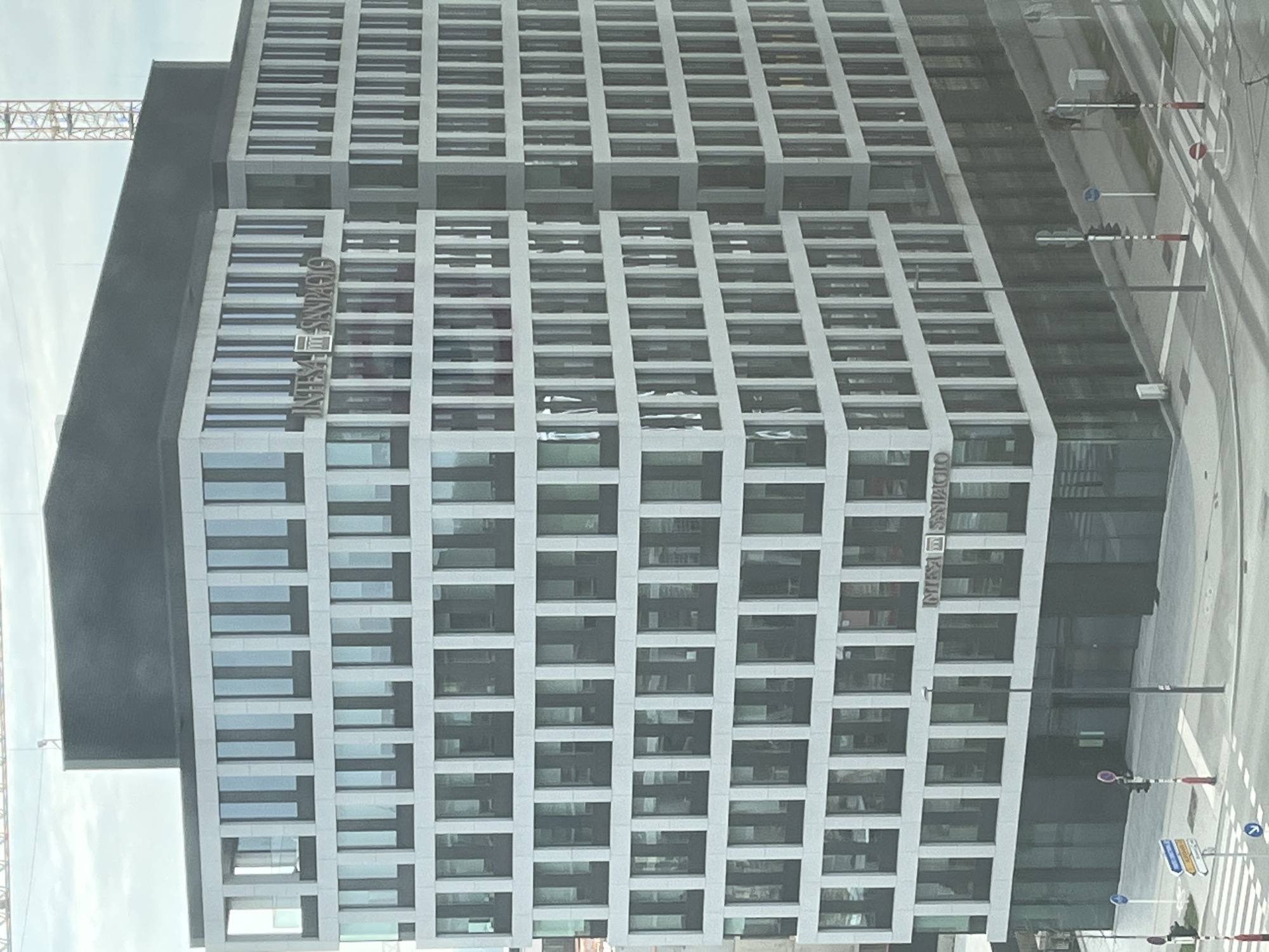 The image displays the Intesa Sanpaolo office building located at 26 Boulevard Royal in Luxembourg City, Luxembourg. The multi-story structure exhibits a modern architectural style with a light-colored, possibly white or light grey, facade consisting of repetitive rectangular panels and dark-framed, vertically oriented windows arranged in a grid pattern across multiple levels. A dark, flat section forms the roofline. The corporate name "INTESA SANPAOLO" with its logo is prominently featured on two distinct sections of the visible facade. At ground level, the building incorporates large, dark glass panels. The surrounding streetscape includes a paved road with multiple white-striped pedestrian crosswalks. Several traffic lights with red and black striped poles are present, alongside various street signs, including blue and white directional signs and a circular 'no entry' sign. Black streetlamp poles are also visible. In the upper background, a portion of a yellow lattice construction crane is visible against a bright, overcast sky. No individuals or specific activities are discernible within the frame.