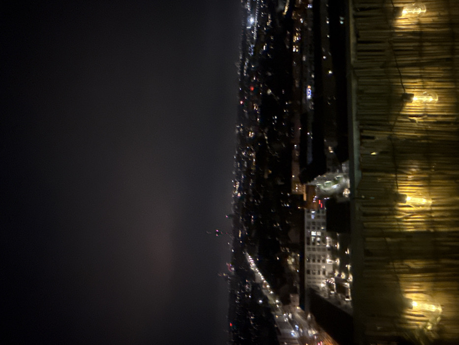 A high-angle view at night showcases a cityscape with numerous lights illuminating buildings and streets. The city extends towards a dark, vast expanse, likely the sky. Along the right edge, a rustic wooden structure is adorned with several lit string lights, providing a warm contrast to the cooler city lights. The scene suggests an urban setting observed from an elevated vantage point.