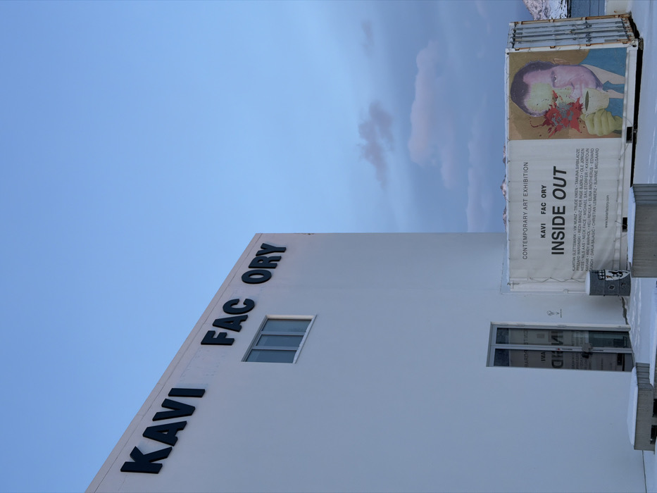 The Kavi Factory building in Henningsvær, Norway, is depicted from an exterior, slightly low-angle perspective under a pale blue sky with faint, scattered clouds. The modern, minimalist structure is predominantly white, featuring the words "KAVI FACTORY" in large, dark, sans-serif lettering affixed to its upper facade. Below the signage, a multi-pane rectangular window is present. At ground level, a glass double door entrance reflects the interior. Snow covers the ground and two low, rectangular concrete blocks in front of the entrance. Adjacent to the building on the right stands a white shipping container, utilized as a display for a "CONTEMPORARY ART EXHIBITION" titled "INSIDE OUT," with "KAVI FACTORY" branding. The banner includes a list of contributing artists and a prominent graphic of Richard Nixon, whose face is partially obscured by colorful splatters originating from a coffee cup he is holding. A grey cylindrical waste bin with an emblem rests beside the container. In the background, a body of water separates the foreground elements from distant snow-capped mountains under the horizon. No individuals are present.