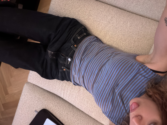 A person lying on a beige couch wearing a blue and gray striped shirt and dark-colored jeans. Their head is tilted back, and they are sticking out their tongue. A small black tattoo is visible on their leg. A black object, possibly a tablet or phone, is partially visible in the lower-left corner of the image, resting on the couch. The floor appears to be wood.