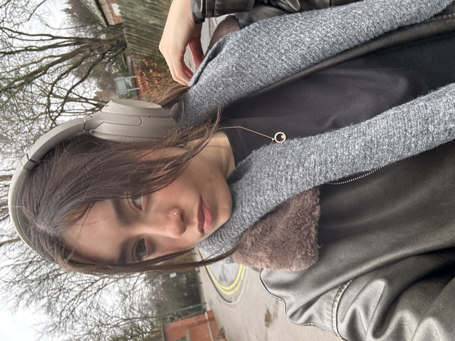 The image depicts a young female subject outdoors on a street in Hull, United Kingdom. The subject, positioned centrally and angled slightly to her right, has medium-length dark brown hair, light-colored eyes, and a small stud piercing in her left nostril. She wears light grey over-ear headphones, a dark, possibly leather, jacket with a brown faux fur collar, a grey knitted scarf, and a black top with a gold-colored circular pendant necklace. Her left hand is visible near her right shoulder, adjusting or holding her jacket/scarf. She looks directly at the camera with a neutral expression. The background shows an overcast sky and a street environment. To the left, a paved road with double yellow lines is visible, appearing wet. Adjacent to the road, a substantial red brick wall or gatepost structure with a decorative cap is present. Beyond this, several bare deciduous trees indicate a colder season. In the mid-ground and background to the right, more bare trees are visible, along with a low, dense hedge and the roofline of a residential building. The general environment suggests a tree-lined residential street or an area bordering a park.