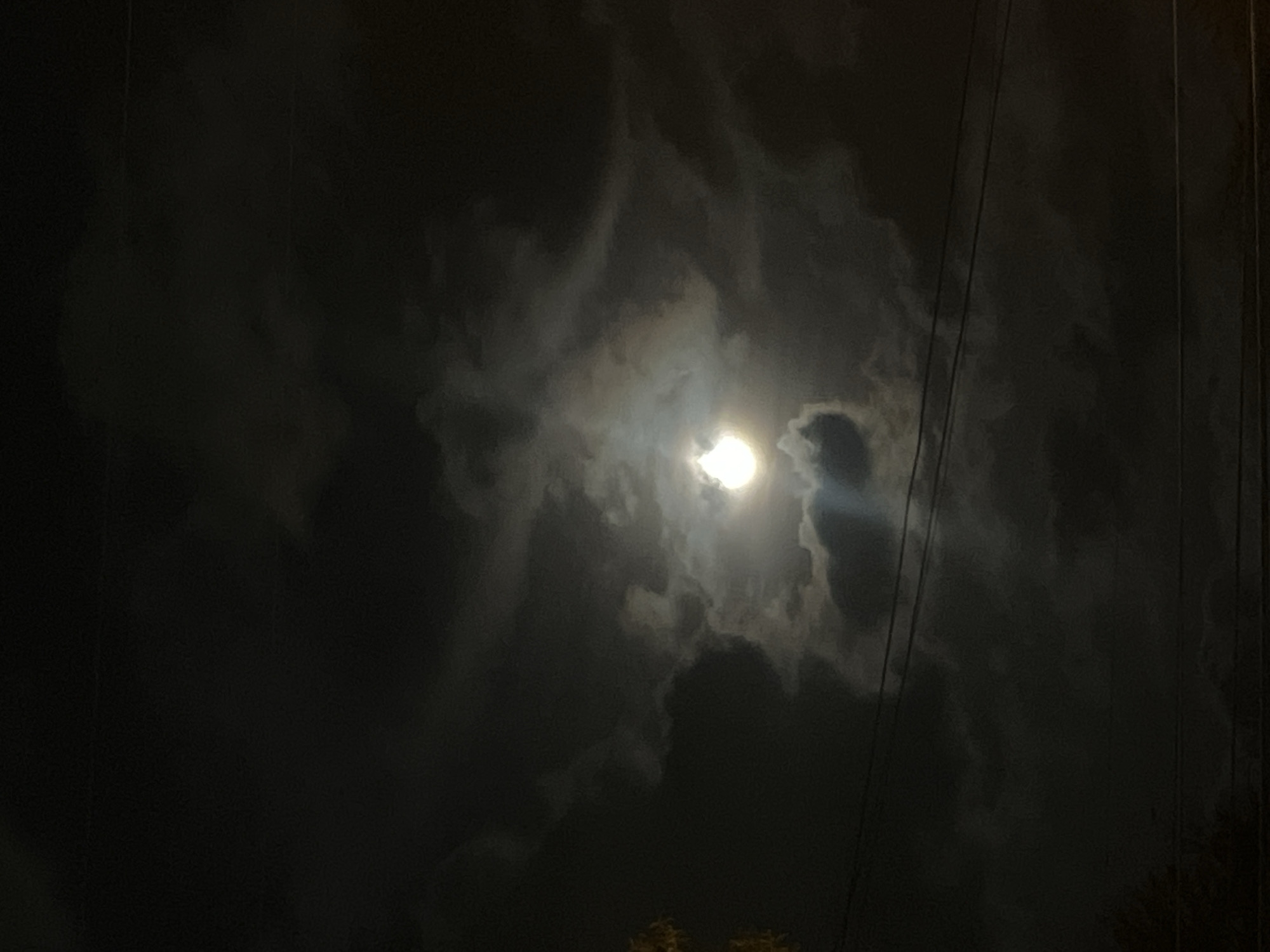 A nighttime scene with a bright moon obscured by clouds. Power lines are visible in the upper right. The scene is dark and indistinct. The location is unknown and not supported by information in the image.