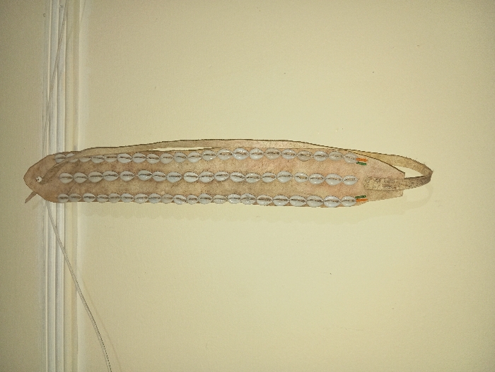 The image displays an elongated, decorative object of cultural origin, suspended against a light-colored wall in Ewuaso Oonkidong'i ward, Kenya. The object is constructed from a light brown or beige hide or leather-like material, featuring a main body approximately 50-60 cm in length, narrowing towards both ends. Three distinct vertical rows of light-colored cowrie shells are meticulously attached along the center of the main body. Each shell is oval, off-white, and exhibits a prominent dark central slit. A narrower, unadorned strip of the same material runs parallel along the right edge of the main body. Near the bottom, two small clusters of colored beads, specifically green and orange, are integrated into the decorative scheme. The lower end of the object forms a rounded loop, while the upper end tapers to a point with a visible perforation, indicative of a hanging mechanism. The background consists of a smooth, cream-colored wall. Above the object, a section of white architectural trim or molding is visible, along with a thin, light-colored wire or string extending horizontally across the upper left quadrant of the frame. No individuals or active interactions are present in the static scene, which is lit by what appears to be ambient indoor light.