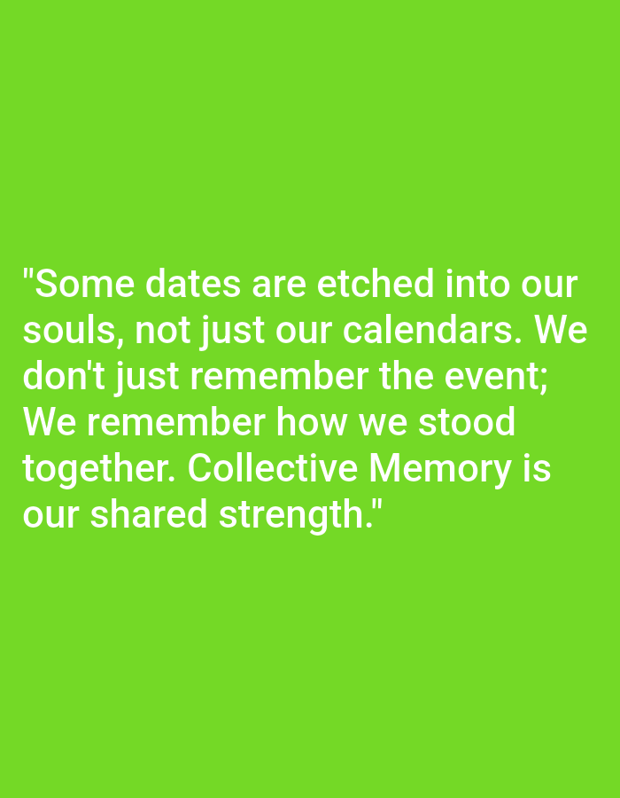 This scene, located in the city of Blangkutacoh, Indonesia, depicts white sans-serif text against a uniform lime green background. The text is horizontally centered and occupies the lower portion of the frame. It reads: "Some dates are etched into our souls, not just our calendars. We don't just remember the event; We remember how we stood together. Collective Memory is our shared strength." No individuals, specific objects beyond the text, actions, interactions, or discernible environmental elements are present. The background is a solid, untextured color.