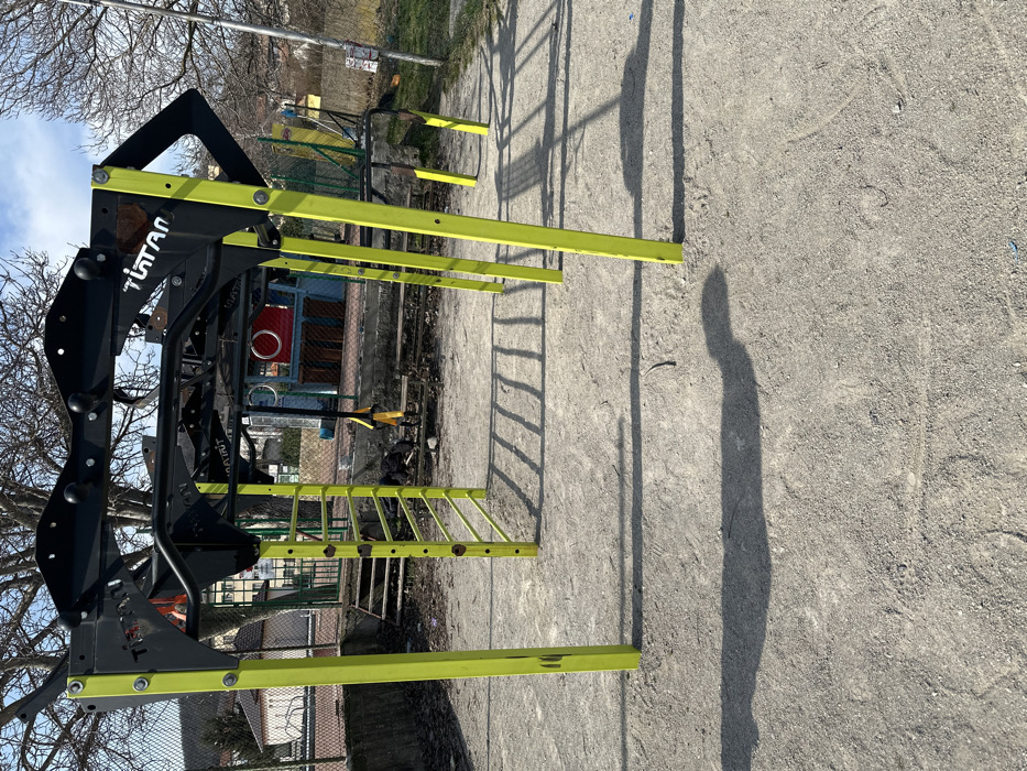 The image displays an unoccupied outdoor fitness area situated in Dryanovo, Bulgaria, illuminated by direct sunlight. A multi-station fitness rig, prominently branded "TITAN," is centered in the frame. This structure is composed of black metal sections, including various overhead bars, supported by bright neon yellow vertical posts. A yellow-rung ladder is integrated into the rig's left side, and yellow-accented suspension straps hang from an overhead bar on the right. The ground consists of light-colored, compacted dirt or gravel, upon which distinct shadows from the rig and a large, amorphous shadow (likely from the photographer) are cast. In the background, a chain-link fence delineates the fitness area from beyond, where bare deciduous trees and sections of residential buildings are visible. A small, blue and red structure, possibly a playhouse, is present behind the fence, with red and white rings suspended nearby. Scattered dry leaves are visible on the ground in the background. No individuals or active subjects are present.