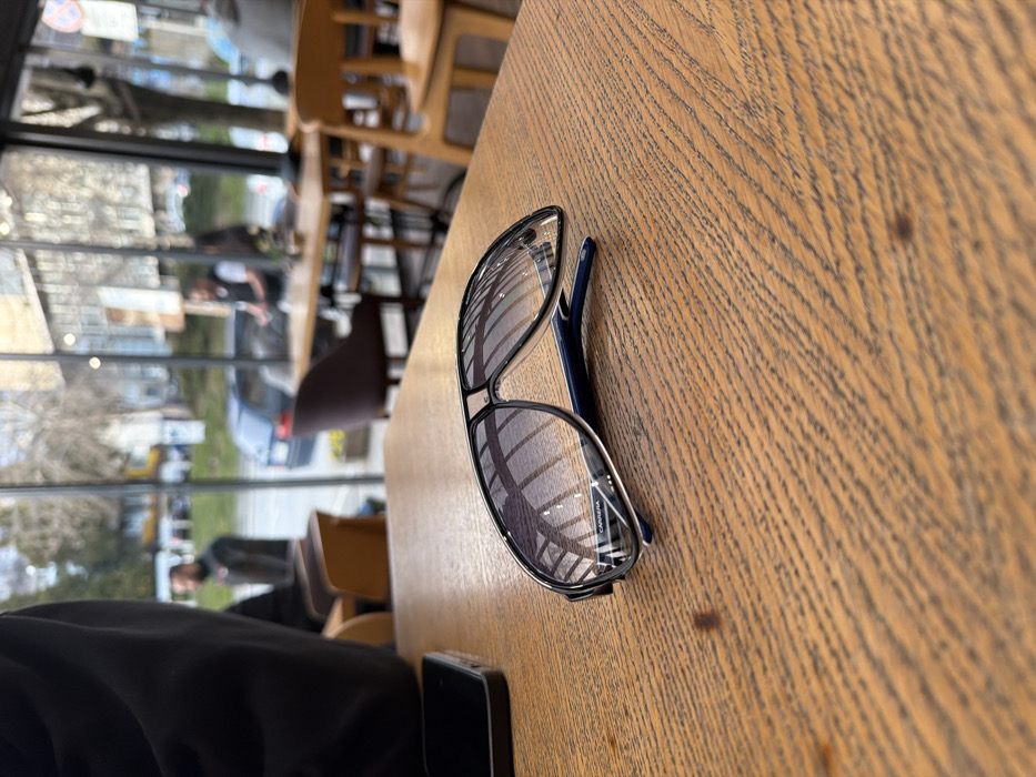 The image displays an interior view of a cafe or restaurant located in Veliko Tarnovo, Bulgaria, looking outwards through a large glass window. In the foreground, a pair of black Carrera aviator-style sunglasses with dark gradient lenses and blue frames rests on a light brown wooden table, exhibiting a distinct grain pattern. A black smartphone is partially visible to the left of the sunglasses. The left side of the frame shows the dark-clad arm and shoulder of an individual, likely the photographer. The midground, through the window, reveals the blurred interior of the establishment with patrons seated at various wooden tables, some featuring dark upholstered chairs. The background, beyond the glass, shows a blurred outdoor street scene. A dark sedan is visible on the street, accompanied by other vehicles and indistinct figures of pedestrians on a sidewalk. Bare trees line the street, indicating a cooler season. Buildings are faintly visible in the far distance.