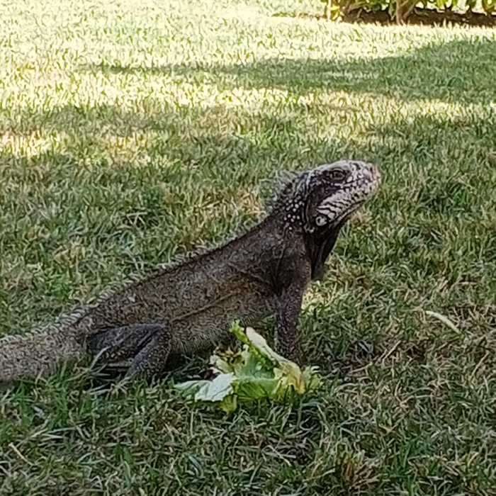 - "A large, grey-brown iguana sits in green grass near a small pile of lettuce" by FM-Ov7T13, licensed under CC BY 4.0