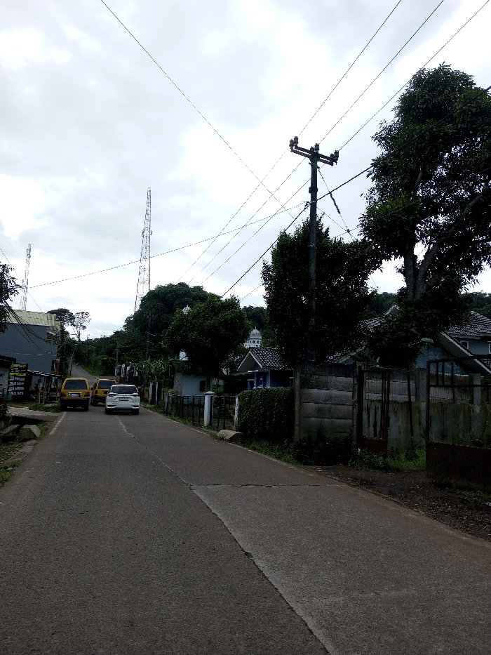 The scene depicts an asphalt road ascending gradually under an overcast sky in Ariyalai, Sri Lanka. Three vehicles are present on the road, moving away from the viewer: a white SUV leads, followed by two yellow sedans. On the left side of the road, a building with a grey roof and light-colored walls is visible, with an attached utility structure displaying unreadable signage. Green foliage partially obscures the lower parts of the building. The right side of the road features a wooden utility pole equipped with multiple cross-arms and numerous overhead power and communication lines. Adjacent to the pole are several large, leafy green trees. Behind these trees, residential structures with peaked roofs are partially visible. A concrete perimeter wall and a metal gate mark property boundaries. Further along the road on the right, a light-colored building with a distinctive white domed roof structure is discernible through the dense foliage. In the background, two tall, lattice-style communication towers rise against the overcast sky. The horizon reveals green, undulating terrain or hills. No individuals are visible.