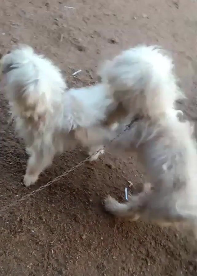 Two small white dogs, both on chains, are play-fighting on a dirt and debris ground. One dog is lying on its back while the other stands over it, both dogs engaging in playful biting and roughhousing. The camera captures the scene from a top-down perspective.