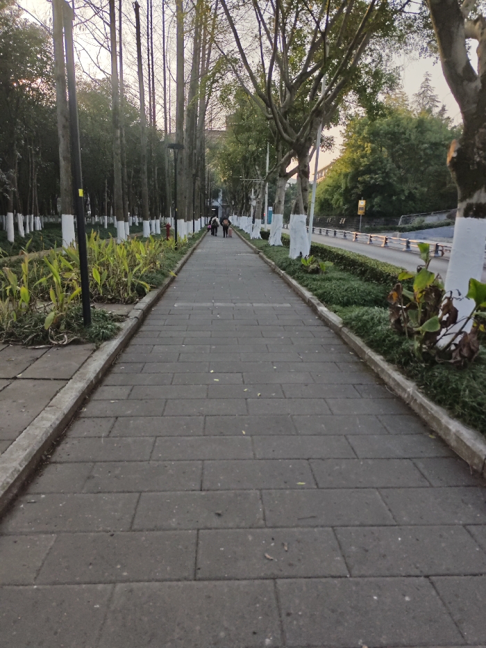 The scene depicts an outdoor pedestrian walkway in the Chongqing High-tech Zone, China, viewed from a low angle looking forward. The pathway is constructed of rectangular gray paving stones and extends into the distance, with two indistinct human figures walking away from the camera in the mid-ground. On the left side of the path, a concrete curb borders a planting area containing low green ground cover and taller, lighter green plants. Behind this, a line of tall, slender trees with dark bark stands, several exhibiting white paint on their lower trunks. Interspersed among these trees are dark streetlights; one red fire hydrant is visible further along the path. Beyond these trees, a denser canopy of green foliage and faint building structures are present. On the right side, a similar concrete curb borders a narrower strip of green ground cover and smaller shrubs, some appearing dry or withered. Adjacent to this strip are trees with thicker, more gnarled branches, also featuring white paint on their lower trunks. Beyond these trees and shrubs lies a paved road with a metal barrier/guardrail. Various roadside markers or signs are visible. The background on this side consists of dense green trees and distant structures under a lightly clouded sky, indicating late afternoon or early evening.