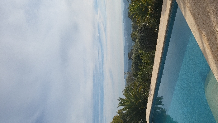 The scene is an exterior view, likely from a residential or leisure property, within or overlooking the Polígon Industrial De Calvià, Spain. A rectangular swimming pool, filled with clear blue water and featuring visible blue mosaic tiling at its bottom, occupies the lower portion of the frame. Light-colored, textured coping stones surround the visible edges of the pool, with integral steps evident at the lower-left corner. Beyond the pool, a band of dense green Mediterranean vegetation, including prominent palm trees, forms a natural barrier across the midground. In the distance, an expansive landscape of rolling hills with scattered urban development is visible, extending towards a hazy horizon line. The upper half of the image is dominated by a light blue sky with scattered, thin white clouds. No human figures, animals, or active subjects are depicted. The environment is illuminated by natural daylight, indicating clear weather conditions.